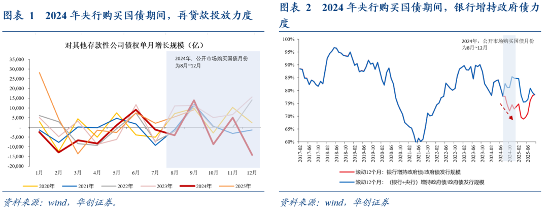 第三,关注后续总量货币(M2)的变化。从货币派生逻辑来看,只有银行体系增持国债才会派生货币,如果是非银机构增持国债不会带来货币派生,只是货币所有权的转移。2024年经验来看,央行公开市场购买国债期间,银行反而会减少持有国债的规模。后续央行公开市场购买国债期间,如果银行加大增持国债,这可能对总量M2产生积极变化,总量M2的抬升有助于M1(实体经济流动性)和非银存款(金融市场流动性)的改善;但如果银行减少增持国债,那可能对总量流动性的影响偏小。