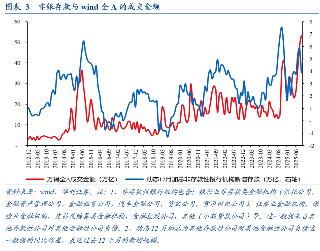 首先,从数据上观测,非银存款的多寡与权益市场的成交金额高度相关。由于非银机构在二级市场无论买股还是买债,都不会导致非银存款的消失,只会造成非银存款的转移,因此非银存款可以定义为金融市场的欠配资金。历史数据来看,非银存款越多,wind全A的成交金额相对越高。