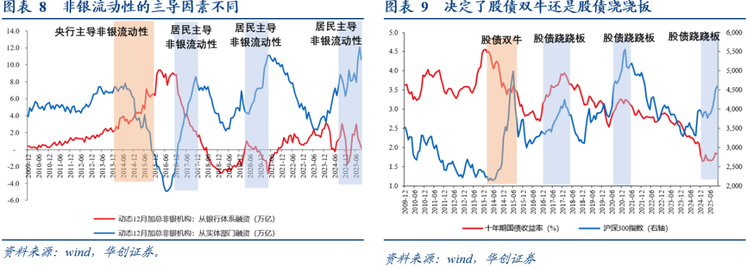 3、历史经验来看,股债双牛需要央行流动性投放的持续加码,但在居民存款搬家的背景下,由于居民存款搬家存在脉冲性,大概率会带来非银存款异动,而非银存款的异动就会带动资产价格的快速抬升。资产价格上涨越快,越有触发监管机构政策对冲的可能。本轮居民存款淤积+权益市场底部有保障的背景下,后续居民存款的持续搬家仍是大概率事件。因此我们仍然维持大周期看股做债的判断,股向上突破表达风险偏好,债券承压概率大;股向下突破表达风险偏好,债券上涨概率大;股市趋势未明呈现箱体低波震荡时,债券也箱体震荡为主,此时股债跟随央行的一些流动性高频操作,可能在在较短周期维度(周度、旬度)形成股债双牛现象。