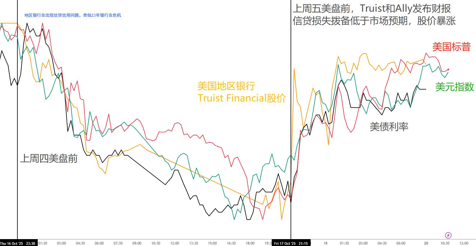 地区银行Truist Financial于上周五美市盘前发布财报,其中信贷损失拨备低同比下滑,低于市场预期,同时并未涉及近期破产的两家汽车相关企业Tricolor和First Brands的信贷业务。这让市场缓解了对美国地区银行的系统性信用风险的恐惧。也就在Truist财报发布后,地区银行指数与美股大盘开始上涨,汽车贷款机构Ally Financial发布财报(信贷拨备同样低于预期)加速大盘的反弹。