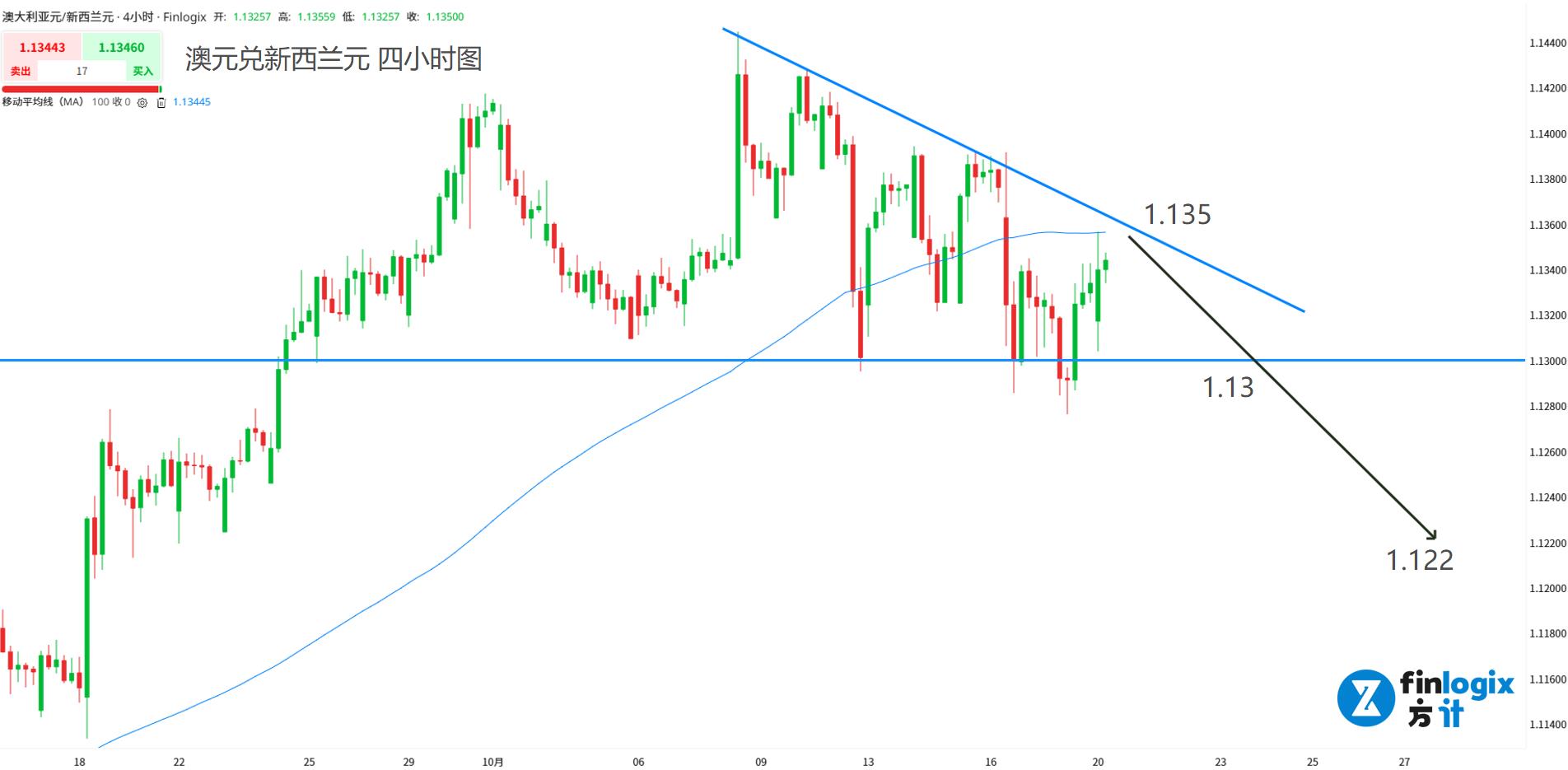 技术面:100均线水平,方向未定,考虑到强价值背离,不设止损。交易策略以顺势跟空为主,关注趋势线位置的压力情况。中短线交易也可以耐心等待价格突破1.13关键颈线,跟随做空。