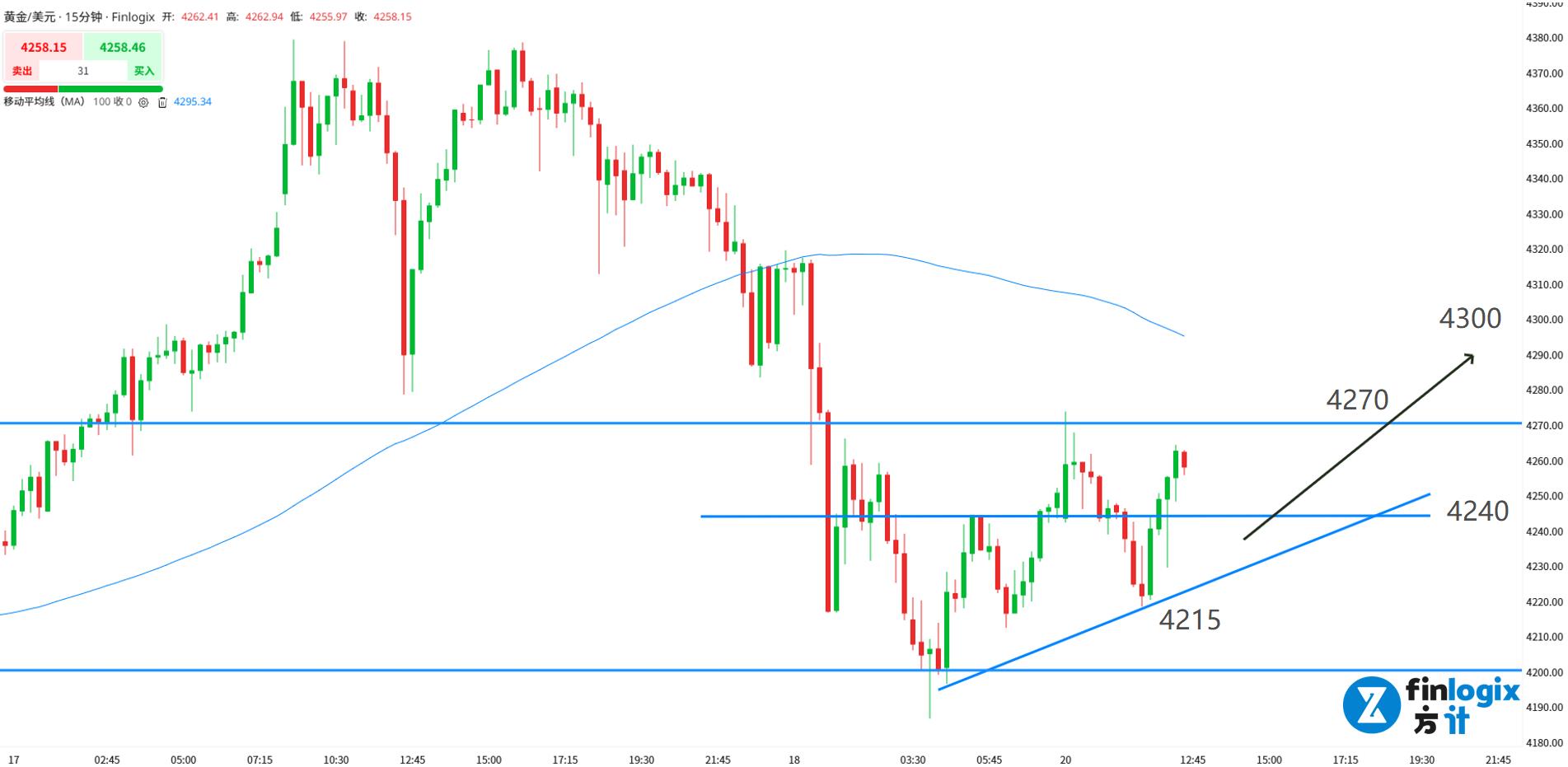 技术面: 100均线向下,多单设好止损。现价位置形成反转结构,但金价还未突破4270颈线关口,考虑到消息面反复,金价处在高位,因此暂时还是以回踩看涨为主。止损放在趋势线4215附近。4200容易出现假突破,需要等待价格站稳后再行入场多单。
