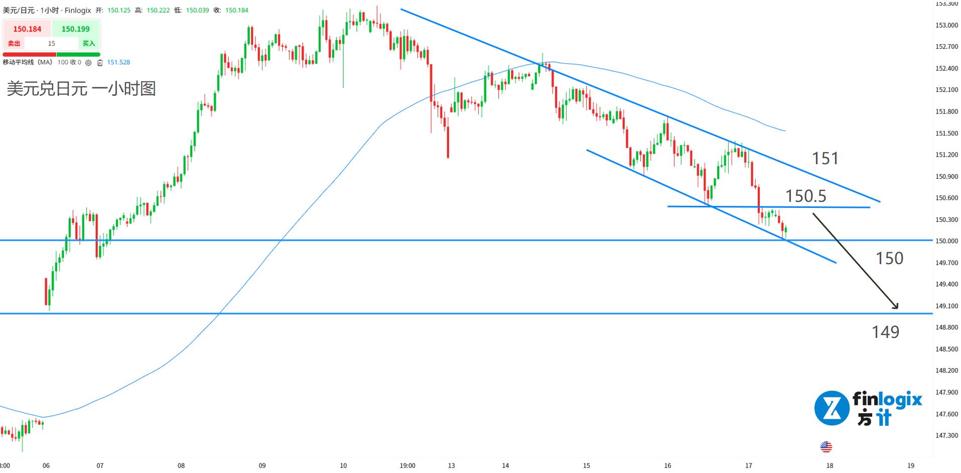 技术面:100均线向下,下降通道保持完整,空头动能极强。考虑到美股可能出现反弹,交易策略以高空为主,关注150.5的支阻互转水平线。但如果直接跌破150,同样有继续跟空的机会。