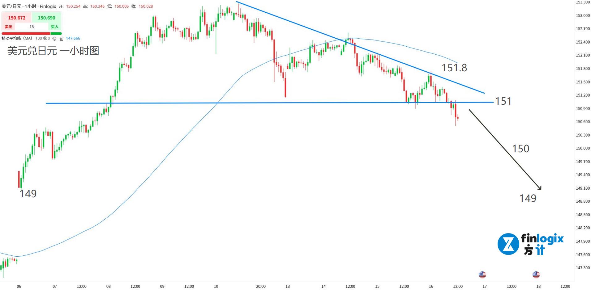 技术面:100均线转头向下,美日跌破151关键颈线,突破三角向下收敛,空头动能强劲。交易策略以颈线下方逢高做空为主。下方的回调空间非常大,因此可以考虑延长持单时间。