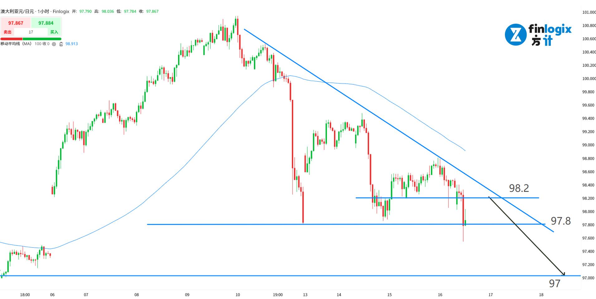 技术面:100均线向下,趋势线提供强阻力。现价触及前低点关键支撑97.8关口,早盘动能不一定足够突破,因此交易策略以等待反弹后逢高做空为主。或者等待美盘向下突破跟随做空。
