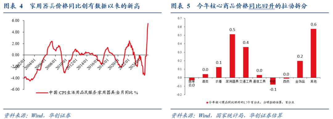 核心商品价格同比相比1-2月份回升约1.7个百分点,主要来自三个因素影响:第一,受益于消费品以旧换新政策和产能治理成效显现,家用器具(家电)价格同比从-3.4%升至5.5%,创2002年有数据以来新高,交通工具(汽车)价格同比从-4.3%回升至-1.9%,两者的边际拉动约0.5和0.4个百分点。第二,受金价上涨影响,金饰品价格同比从年初的30%升至42.1%,边际拉动约0.2个百分点。第三,烟草酒类、通信工具、西药基本没有明显的边际影响,衣着边际拉动0.1个百分点,中药边际拖累0.1个百分点,其余未公布数据的细分项,合计的边际拉动约有0.6个百分点。