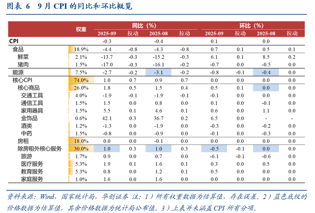 CPI环比上涨0.1%,与过去五年同期均值持平。从大类来看,食品价格环比基本符合季节性;受油价影响,能源价格下跌;核心CPI环比持平,受暑期结束和中秋节较往年错月叠加影响,略低于季节性表现。具体来看: