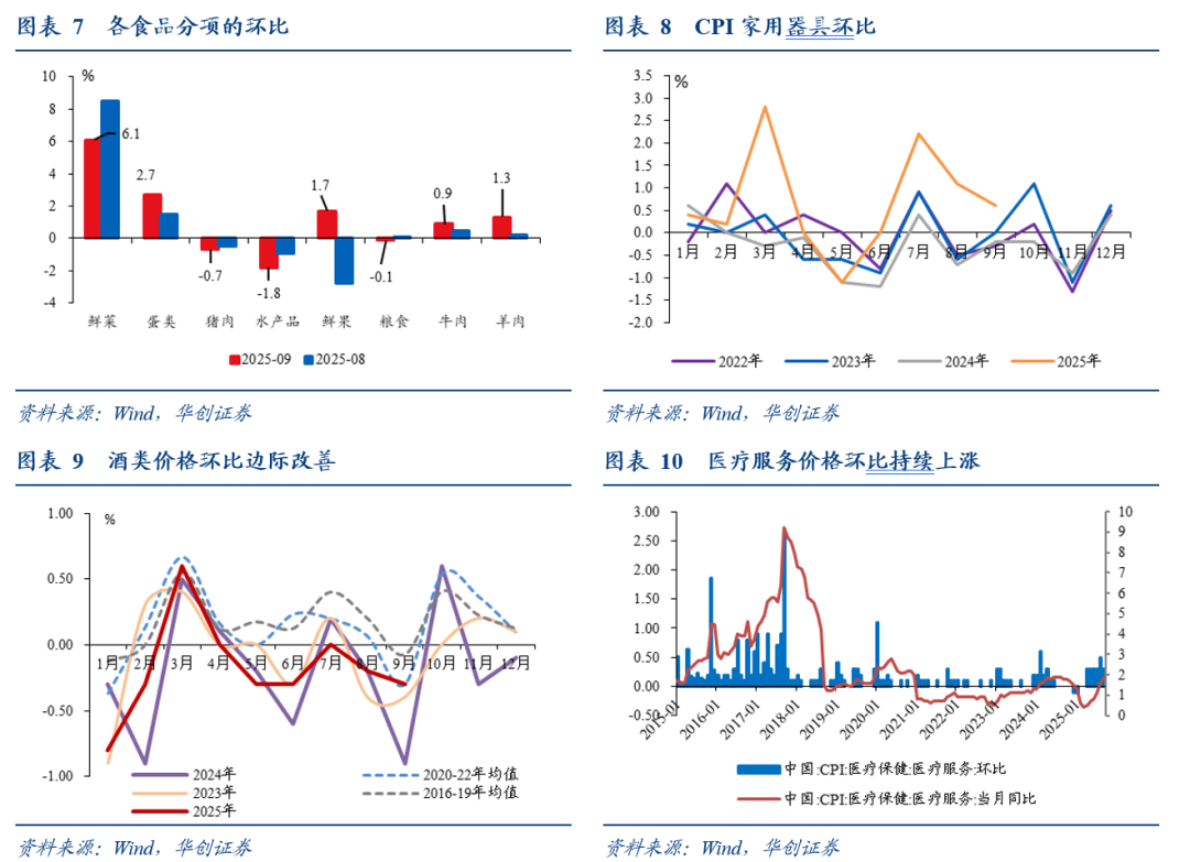 Ø 核心商品价格涨幅从0%升至0.5%,耐用品中,汽车、家电和手机等价格改善边际趋缓,但金饰品涨价明显;非耐用品中,衣着季节性上涨,酒类价格边际好转。耐用品中,交通工具价格从持平转为下跌0.1%,略低于过去五年同期均值的0%;家用器具价格涨幅从1.1%回落至0.6%,但好于过去五年同期均值的-0.1%,今年以来表现持续好于季节性;通信工具价格从下跌0.1%转为上涨0.1%,好于过去五年同期均值的-0.2%;受国际金价上涨影响,国内金饰品价格上涨6.5%。非耐用品中,酒类价格下跌0.3%,基本符合过去五年的季节性规律,较过去两个季度边际有所好转;衣着价格季节性上涨0.7%;中药价格下跌0.1%,西药价格持平。