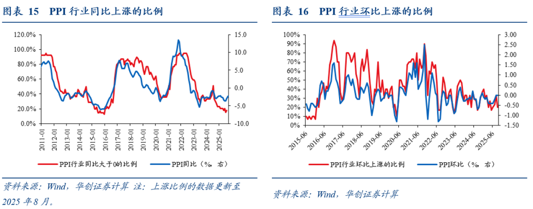 PPI行业的环比涨价比例有所回落,有可比数据的30个行业中,价格上涨的行业个数从10个降至6个,处于2013年8月有数据以来的10%分位。同比来看,39个行业中,8月涨价个数为7个,7月为6个,处于2011年以来的5%分位。(9月行业同比数据尚未完全更新)