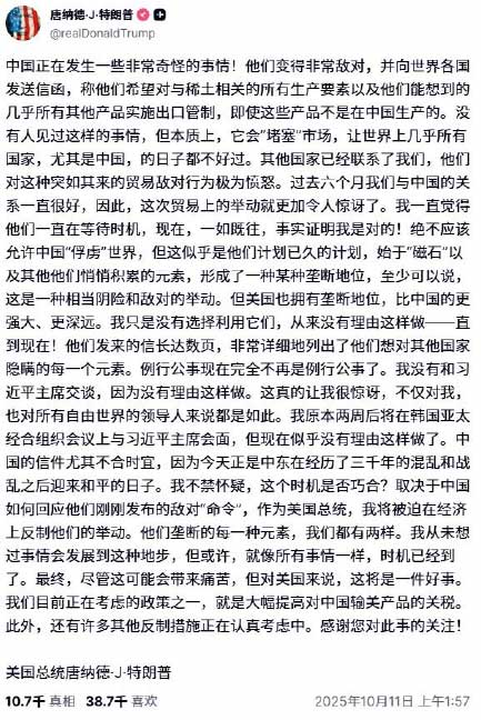事件的导火索要追溯到上周四。中国商务部以维护国家安全和利益为由,连续发布四项公告,对涉及逻辑与存储芯片、半导体设备、军工及关键原材料等领域的出口实施管制,稀土、锂电池材料和超硬材料等均被列入出口管制清单。此举引发特朗普方面的强烈不满,也直接促成了他在上周五宣布全面加征关税的决定。