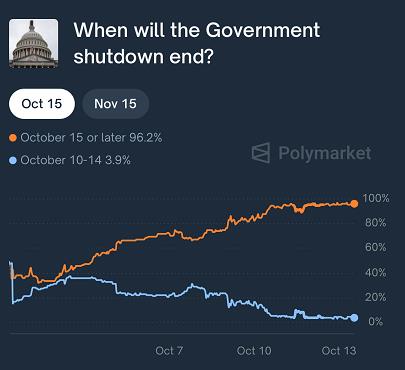 目前押注本周美政府继续关门的概率高达96%,甚至有20%的人押注政府会一直关门到11月中旬。但也就是说,不管是美元还是黄金都已经纳入政府持续关门的预期,如果本周政府恢复运营,则美元将短线保障,而金价将暴跌。