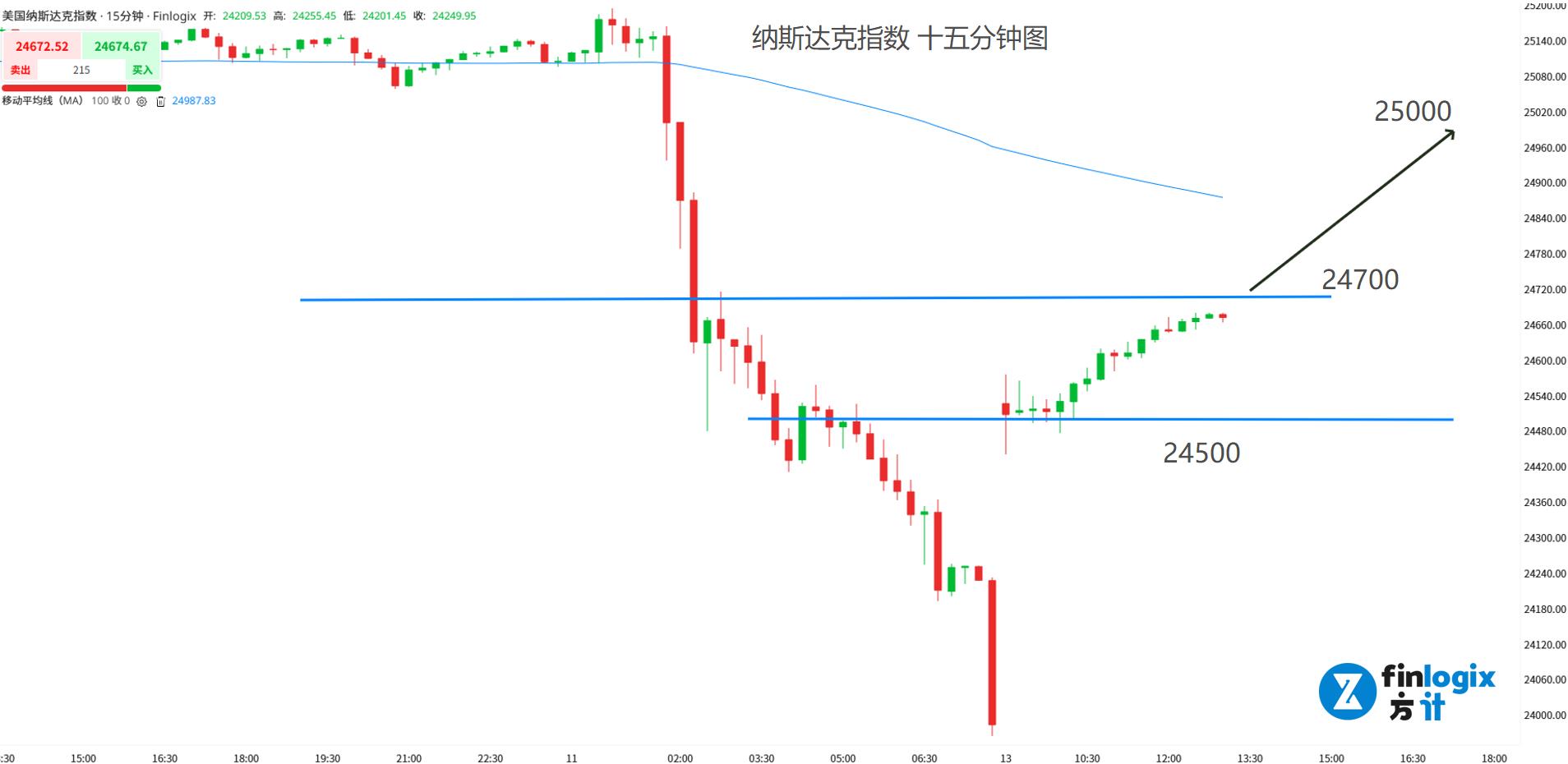 技术面:100均线向下,多单需要设好止损。看涨纳指的前提是,特朗普没有发布更加激进的关税政策。因此为了应对这部分不确定性,止损位置可以放在今早开盘点24500关口。多单也以顺势看涨为主,等待突破24700关口提高胜率。
