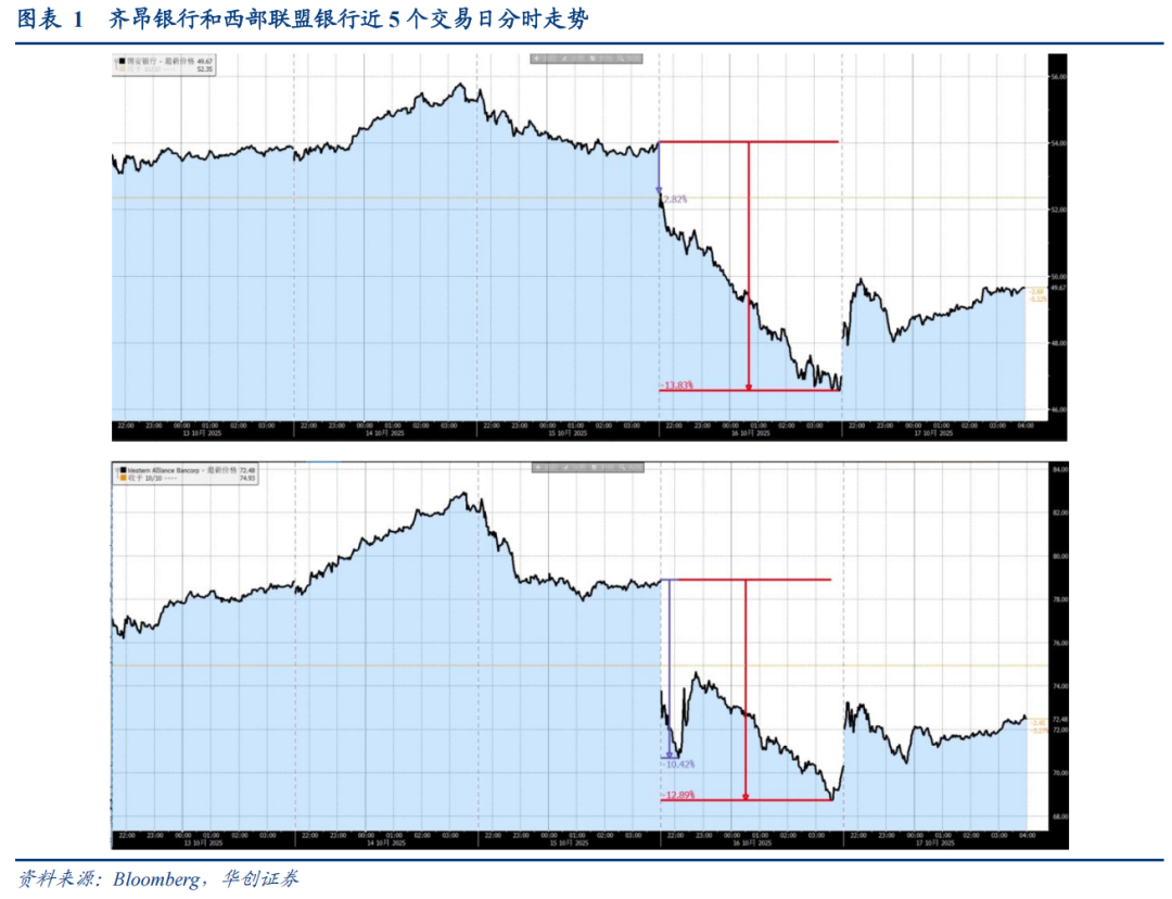 就两家地区性银行报告信贷欺诈事件而言,涉及金额相比前两起案件较小。齐昂银行向投资基金Cantor II和Cantor IV提供了逾6000万美元的贷款(已经提起诉讼追讨),并且于第三季度计提5000万美元拨备损失,截至2025Q2该行总资产约为889亿美元,净资产约为66亿美元。西部联盟银行也向同一投资集团提供了贷款,未偿余额为9860万美元,截至2025Q2该行总资产约为867亿美元,净资产约74亿美元。