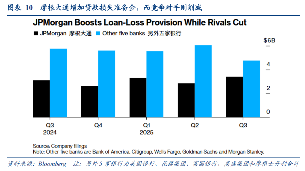 从美国最大的银行第三季度坏账拨备的计提管中窥豹,银行业高管大多有信心认为问题能够得到控制。尽管摩根大通将拨备金提高至34亿美元,但其五大竞争对手的拨备总额却创下两年来的最低水平(图10)。其中摩根士丹利甚至未增加任何拨备。具体而言:1)摩根大通计提了自2020年以来最高额度的拨备,原因是其对破产汽车贷款机构Tricolor的风险敞口遭受冲击,同时增加了信用卡潜在损失准备金。2)摩根士丹利表示此前已为本季度预见的商业地产损失预留资金。3)富国银行和美国银行则表示,由于办公楼贷款损失风险降低,其拨备金较前几个季度有所减少。4)花旗集团首席执行官Jane Fraser指出,尽管经济增长"有所放缓",但经济韧性依然强劲。