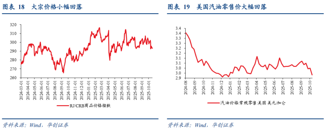 大宗价格小幅回落。10月17日,RJ/CRB商品价格指数293.35,较一周前+0.2%,较两周前-2%。