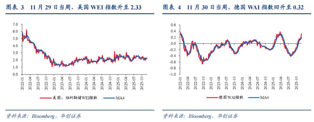 美国经济活动指数中枢反弹。11月29日当周,美国WEI指数2.33(四周移动平均为2.2),上周为2.18(四周移动平均为2.18)。