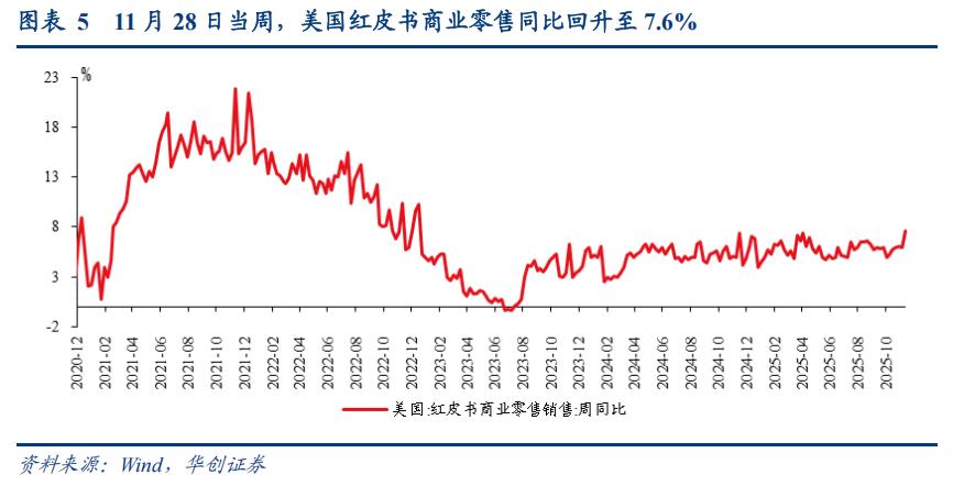 美国红皮书商业零售同比增速大幅回升。 11 月 28 日当周,美国红皮书商业零售同比为 7.6% , 四周移动平均为 6.4% ; 前一周为 5.9% ,四周移动平均为 5.9% 。