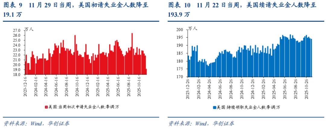 初请失业金人数回落,续请失业金人数大体持稳。11月29日当周,美国初请失业金人数降至19.1万,前一周为21.8万人。11月22日当周,续请失业金人数降至193.9万,前一周为194.3万。