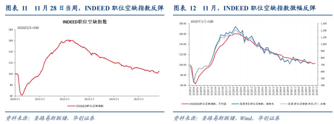 近期职位空缺数低位反弹。 11 月 28 日当周, INDEED 职位空缺指数反弹,周度均值 104.6 ,环比上周均值 +0.6% 。 11 月, INDEED 职位空缺指数均值为 103.1 ,高于 10 月均值 102.1 。