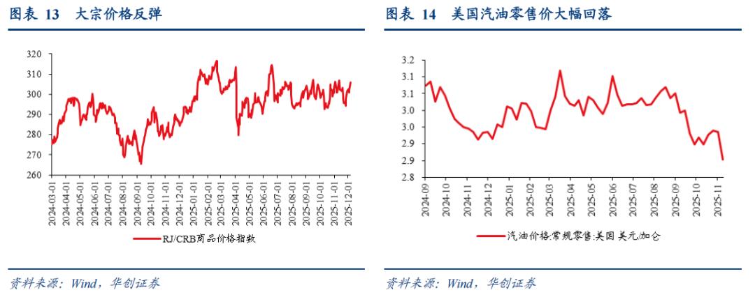 大宗价格反弹。12月5日,RJ/CRB商品价格指数306,较一周前+1.5%,较两周前+3.5%。