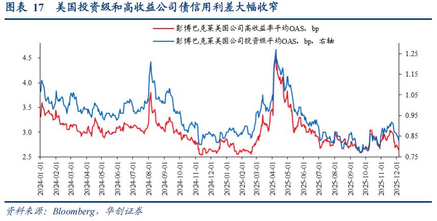 美国公司债信用利差大幅收窄。12月5日,美国高收益公司债利差2.64bp,一周前为2.69bp,两周前为3.01bp。12月5日,投资级公司债利差0.83bp,一周前为0.87bp,两周前0.92bp。