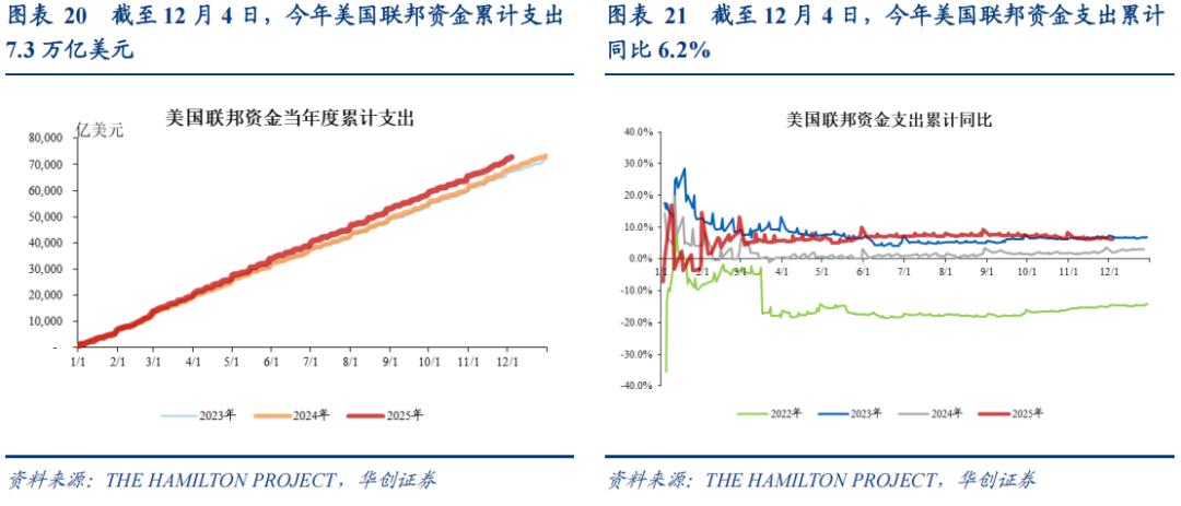 利用美国财政部《每日财政报表》(Daily Treasury Statements)中日度的联邦资金支出规模来高频跟踪美国财政支出变化。截至12月4日,今年美国联邦资金累计支出7.3万亿美元,同比6.2%,好于去年同期的同比2.1%。
