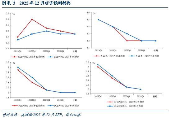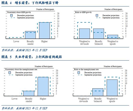 其三,美联储对明年经济的预期是“金发姑娘”。一方面,从经济预测摘要来看,美联储官员上调了2025-2028年的增长预测,下调了2025-2026年的通胀预测。并且对增长前景的下行风险评估明显下降,对失业率前景的上行风险判断有所减弱,对通胀上行的不确定性有所下降。另一方面,鲍威尔认为明年经济可能稳健增长,利好的因素包括:已有降息的影响将逐步体现、消费者支出具有韧性、与AI相关的投资强劲、财政政策将提供支持、政府关门带来的节奏扰动。