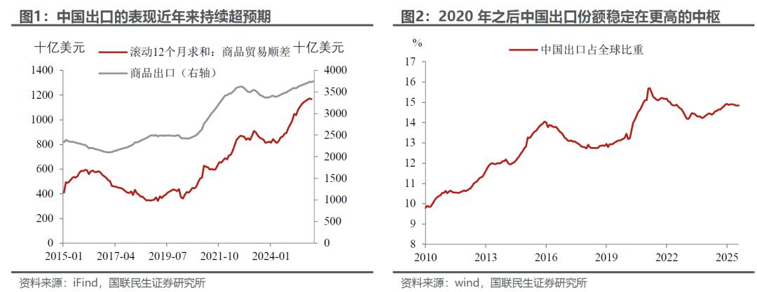 如果说今年中国什么宏观经济数据最难判断,出口数据一定能排在前列。2020年全球公共卫生事件之后,市场认为出口会随着再开放而下滑,结果无论是出口规模还是贸易顺差都持续突破历史高位。今年也一样,外部贸易摩擦和关税风险“风起云涌”,但中国出口的韧性出乎意料:截至今年11月,中国出口和顺差(滚动12个月求和,平滑季节性)规模继续创下历史新高。中国出口为什么持续超出市场预期?
