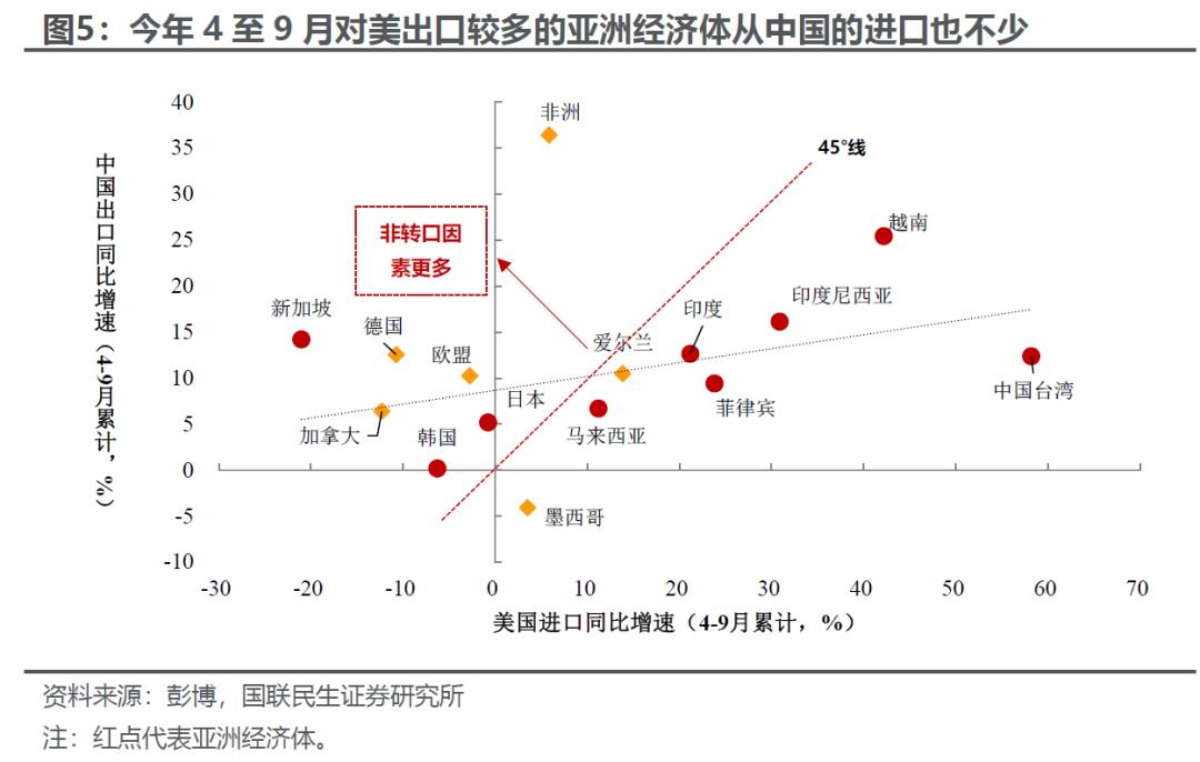 转口贸易依旧存在。一个典型的表现是今年4至9月关税风险较大的时期,对美出口较多的经济体、尤其是亚洲经济体,仍保持了对中国商品的有力进口。