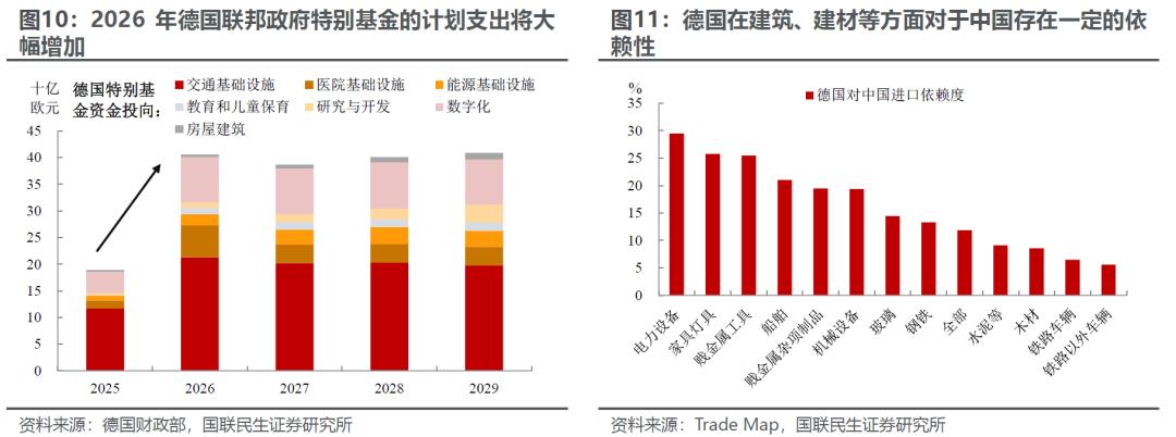 另辟蹊径:欧洲的潜在空间。展望欧洲未来数年,财政政策转向和俄乌冲突走向缓和是两大关键背景。背后绕不开的都是“大兴土木”的建设。尽管德国和乌克兰本身在中国出口中的占比较小,但是背后结构性的机会、对于部分行业的拉动依旧值得关注。