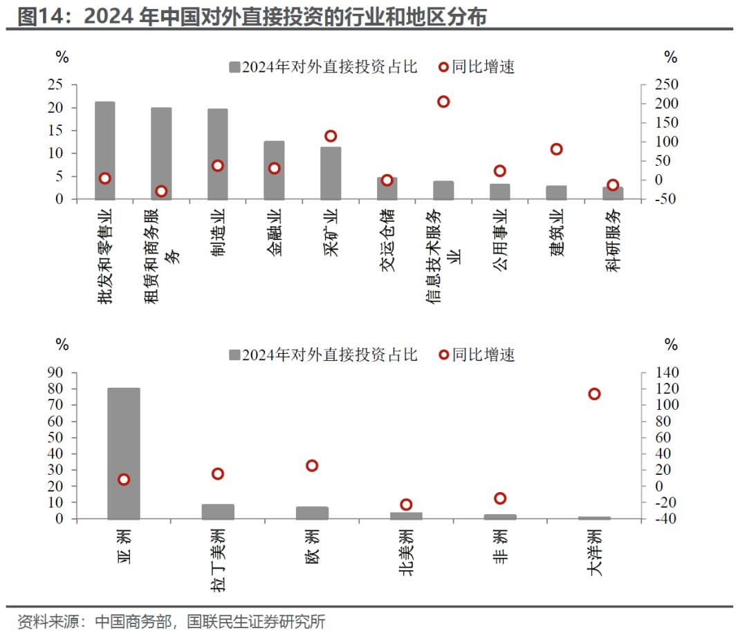 从大行业和地域来看,亚洲尤其是东盟无疑是对外投资的最重要的基本盘,除此之外,欧洲和拉美也是重要的投资地区,2024年增速在25%和15%。值得注意的是大洋洲(2024年同比增速113.7%,主要是澳大利亚),中国也在重视对其采矿业的投资。大行业上,批发和零售业,租赁和商务服务以及制造业是对外投资的三大支柱,不过近些年对于采矿业和信息技术服务业的投资增长明显更快。
