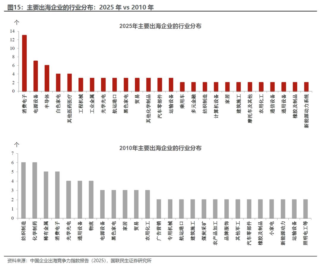 细分行业上,从主要出口企业所在行业来看,与2010年的纺织服装、化工等占主导不同,当下消费电子、电力设备和半导体等或更能代表当前中国制造实力的行业越来越成为出海的主流。