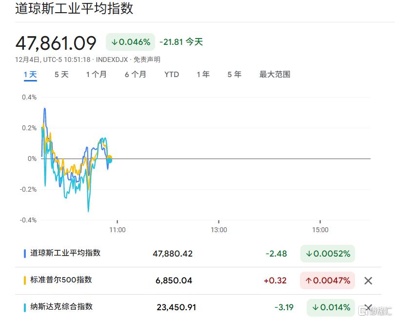 周四美股开盘,三大指数高开低走,盘中转跌。纳指现跌0.014%,道指跌0.0052%,标普500指数微涨。