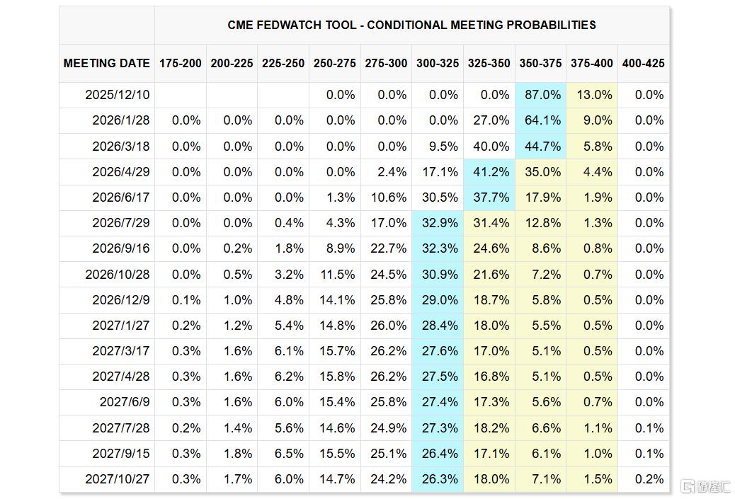 CME美联储观察工具显示,美联储目前有87%的概率降息25个基点,到明年1月累计降息25个基点的概率为64.1%。
